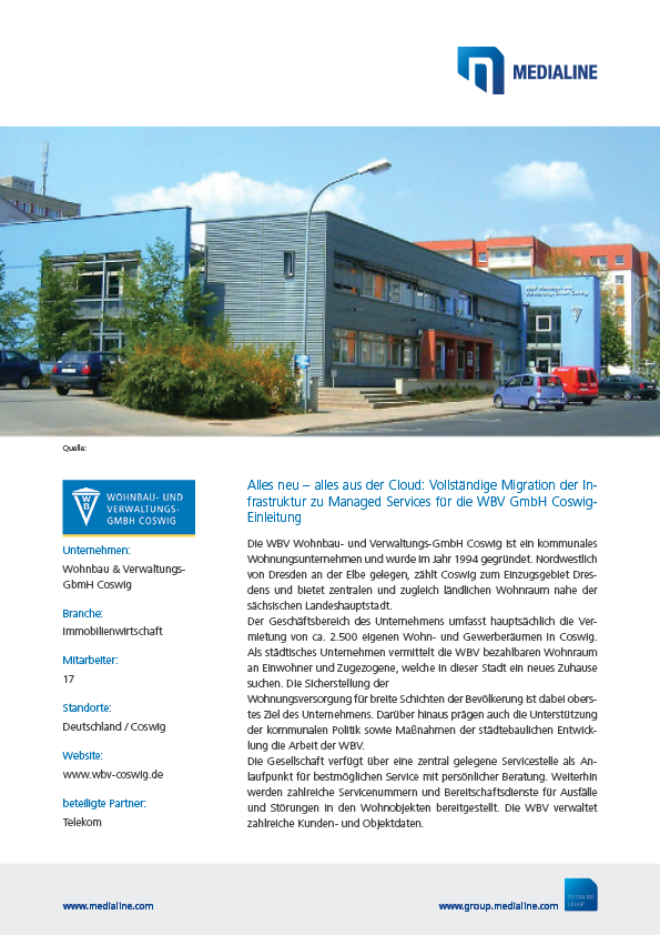Die WBV Wohnbau- und Verwaltungs-GmbH Coswig ist ein kommunales Wohnungsunternehmen ohne eigene IT-Abteilung. Die Neugestaltung der IT sollte mit einem verlässlichen Partner erfolgen. Kernthema war die sichere Verwaltung und Speicherung von Kundendaten. Mit der CompanyCloud und Managed Services wurde dies umgesetzt.