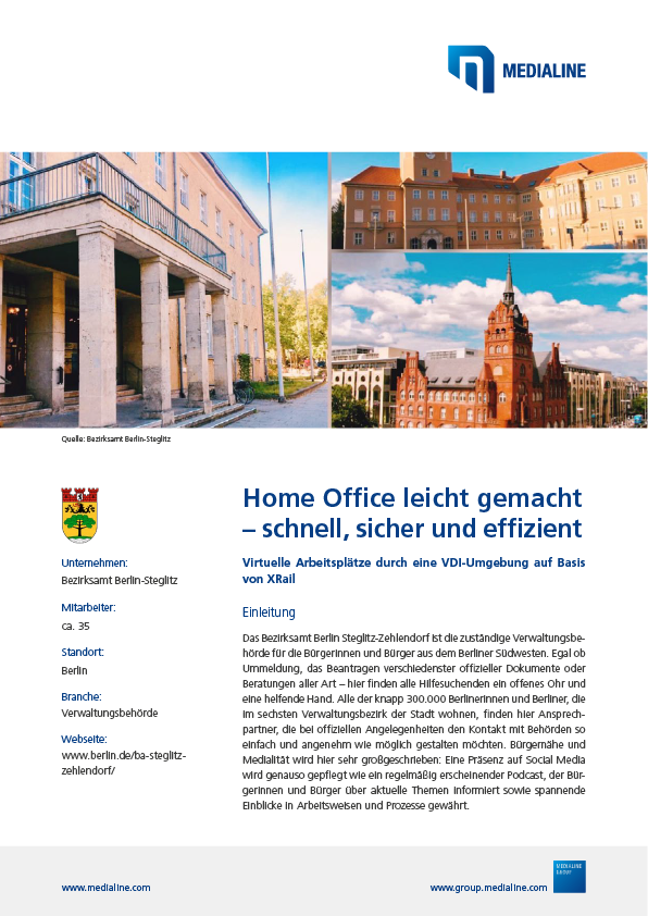 Das Bezirksamt Berlin Steglitz-Zehlendorf, eine zuständige Verwaltungsbehörde, benötigte virtuelle Arbeitsplätze. Innerhalb von 12 Monaten wurden virtualisierte Desktop-Umgebungen für ca. 1700 Mitarbeitende bereitgestellt, die jetzt nutzerfreundliche und ortsunabhängige Zugriffsmöglichkeiten haben.